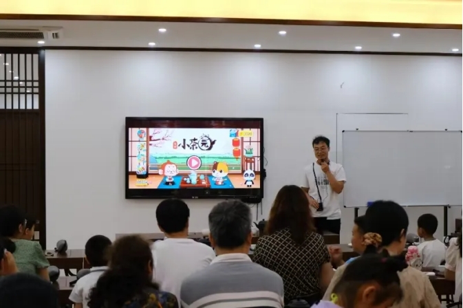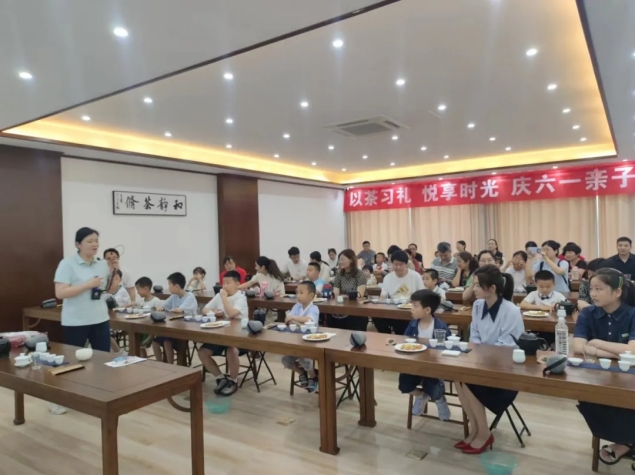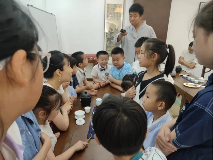 茶修室里,刘芳书记为大家亲切讲解了“神农尝百草,日遇七十二毒,得茶而解之”的故事,张洪涛老师通过趣味游戏为小朋友们介绍了茶叶的采摘和制作流程,谢晨老师带领大家认识茶具、学习传统茶文化,并沉浸式体验了泡茶过程。